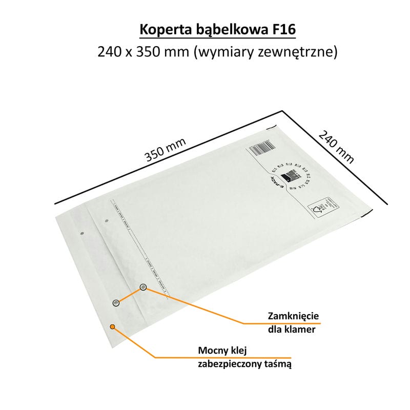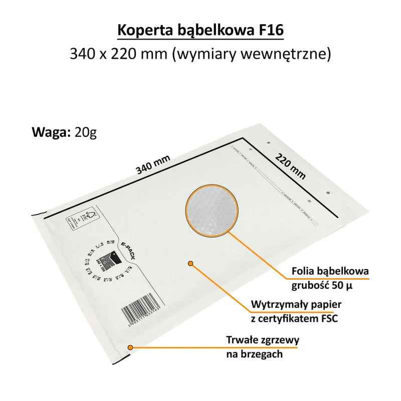 Litteät, herkät ja hauraat esineet, joiden koko on enintään 220 x 340 millimetriä, lähetetään halvimmillaan ja todennäköisesti valkoisessa F16-kuplakuoressa kirjeitsepostitse. A4+-formaatissa on riittävästi tilaa kuville ja valokuville, toimistotarvikkeille, kylteille ja kylteille, pienelektroniikalle ja muille tuotteille. F16-kuplakuorille on ominaista hydrofobisella pinnoitteella päällystetyn voimapaperin kestävyys ja 50 mikrometrin paksuinen kuplakalvo. Lähettäjän ympäristöystävälliset ominaisuudet ja lähestymistapa heijastuvat materiaalien kierrätyksen helppouteen – erota paperi kalvosta ja hävitä se asianmukaisesti. Vahvan liiman avulla voit sulkea kirjekuoren turvallisesti ja lähettää lähetyksen huolimatta pakatuista tuotteista.
