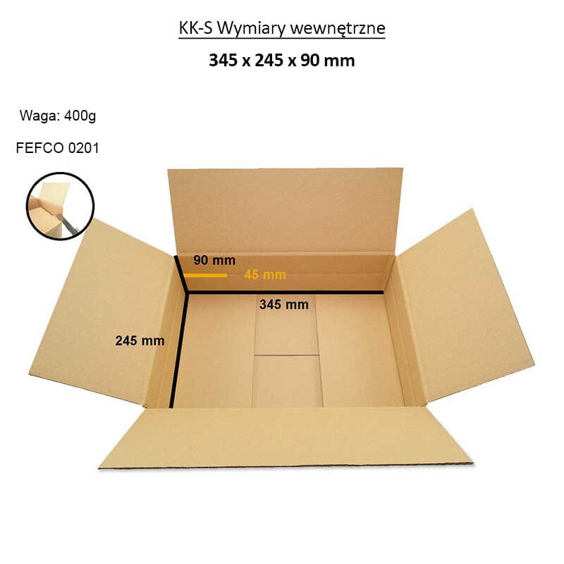 Yleinen läppälaatikko, jossa on klassinen FEFCO 201 -muotoilu, valmistettu aaltopahvista, jossa on optimaalinen B-aalto. Pahviformaatin avulla voit pakata turvallisesti kohteita, joiden mitat ovat jopa 345 x 245 ja korkeus jopa 95 mm – vaatteita, elektroniikkaa, lelut ja koristeet sopivat tähän täydellisesti. Laatikon sisätilavuus on jopa 7,8 litraa. Sen litteä muoto mahdollistaa sen lähettämisen pakettilokeron kauttaKoot A (alemmalle korkeudelle leikkaamisen jälkeen) ja B.