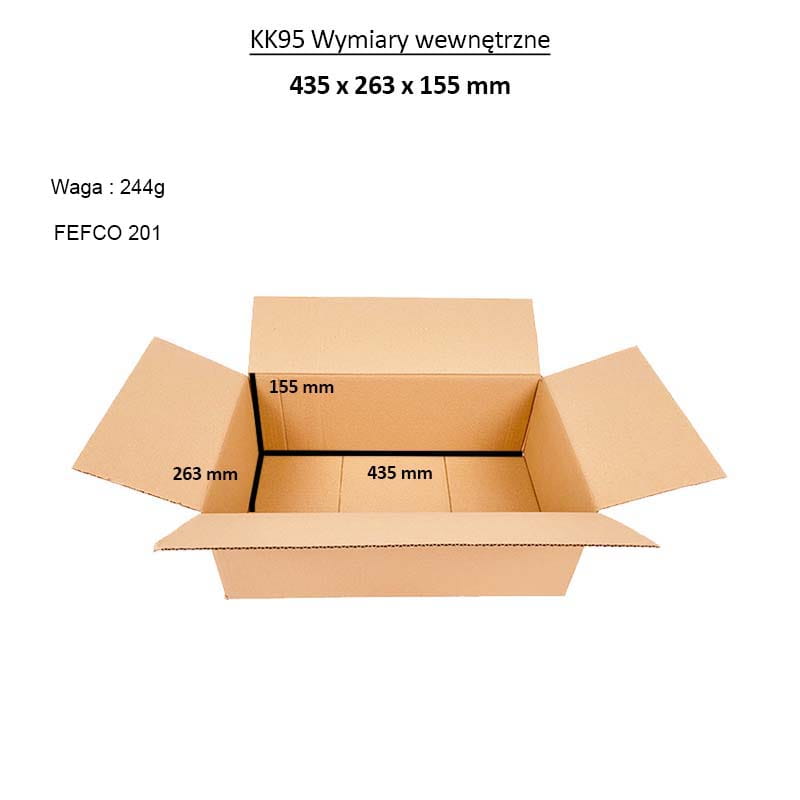 Läppäinen KK-95-kartonki on erittäin käytännöllinen pakkaus moniin pakkaustehtäviin. Erityisesti valitun koon ansiosta sitä voidaan käyttää erilaisten tuotteiden ja esineiden säilyttämiseen ja lähettämiseen, joiden pituus on noin 435 mm, leveys 263 mm ja korkeus 155 mm. Se soveltuu erinomaisesti vaatteiden, asiakirjojen, kirjojen ja julkaisujen, kannettavien tietokoneiden, kansioiden tai muiden toimistotarvikkeiden, jalkineiden, laukkujen ja käsilaukkujen säilyttämiseen tai lähettämiseen. Lähetyslaatikkona siihen mahtuu monia litteitä, jopa raskaita, jopa 20 kg painavia esineitä. . Asianmukainen 3-kerroksinen B-huilupahvi ja laadukas työstö takaavat riittävän turvallisuuden ja suojan iskuja, kosteutta ja puristumista vastaan kuljetuksen aikana, varastossa tai kotona.